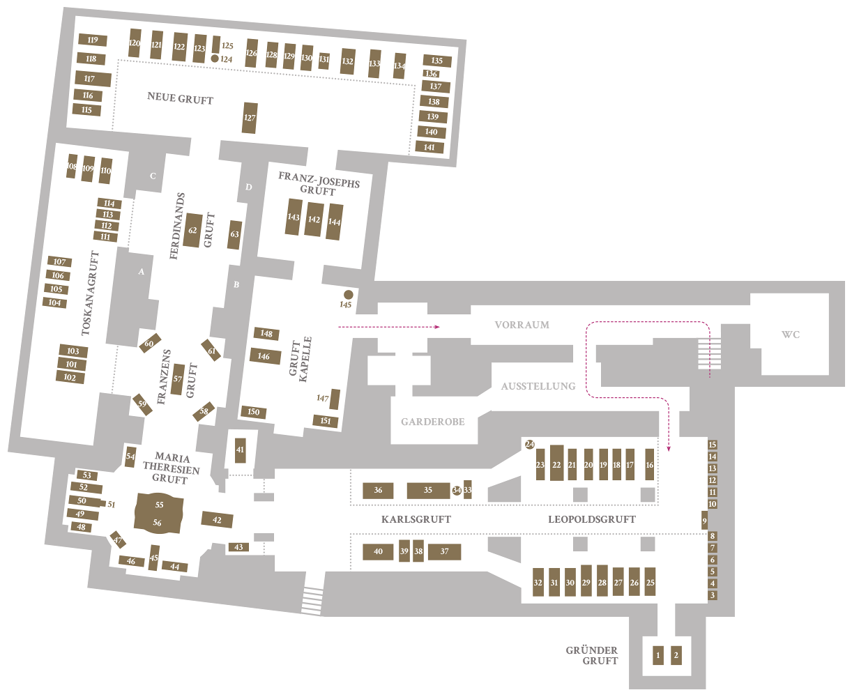 At the same time as the Ferdinand Vault, the elongated Tuscan Vault was built by court architect Johann Höhne. The name comes from the Habsburg-Tuscany branch of the family founded by Emperor Franz I. Stephan.